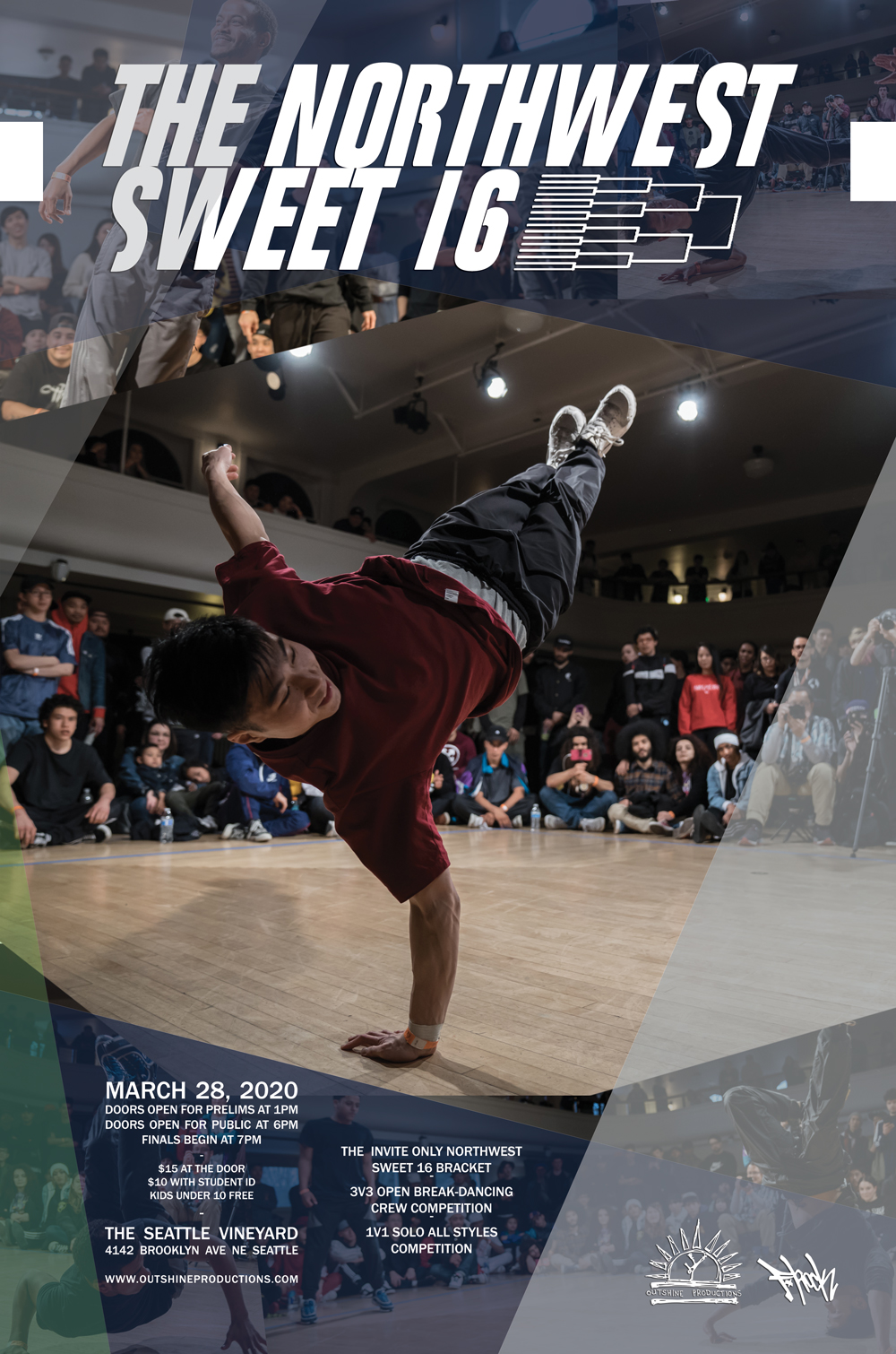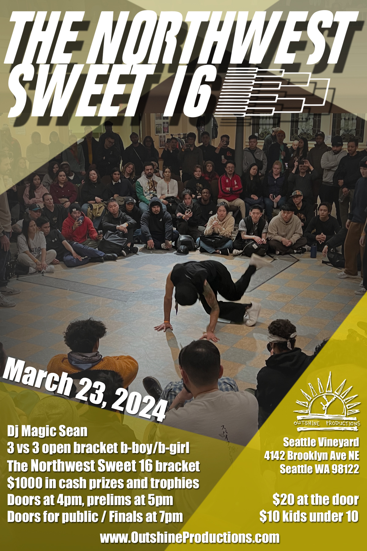 Doors open for competitors at 3pm, battle start promptly at 4pm. Doors open for public at 7pm, finals (including top 8 crews from prelims) start at 7:30pm. Anyone can come early to watch the prelims, but it is recommended for general public to come at 7pm. After party at Time Warp (1420 10th Ave Seattle) after the jam is over.