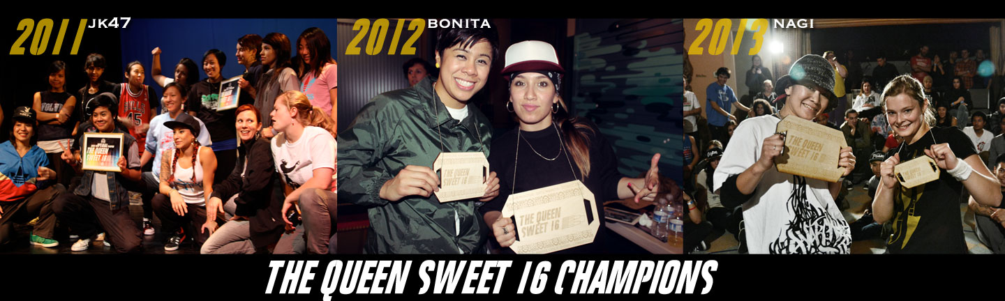 The Queen Sweet 16 is a invite only tournament feature the top b-girls from around the world. In a culture dominated by men, we strongly believe the women of hip-hop should be showcased and honored. Each b-girl is chosen based on her skill level, how respected she is in the community, and what competitions she has won in the past. All time winners from the competition include: